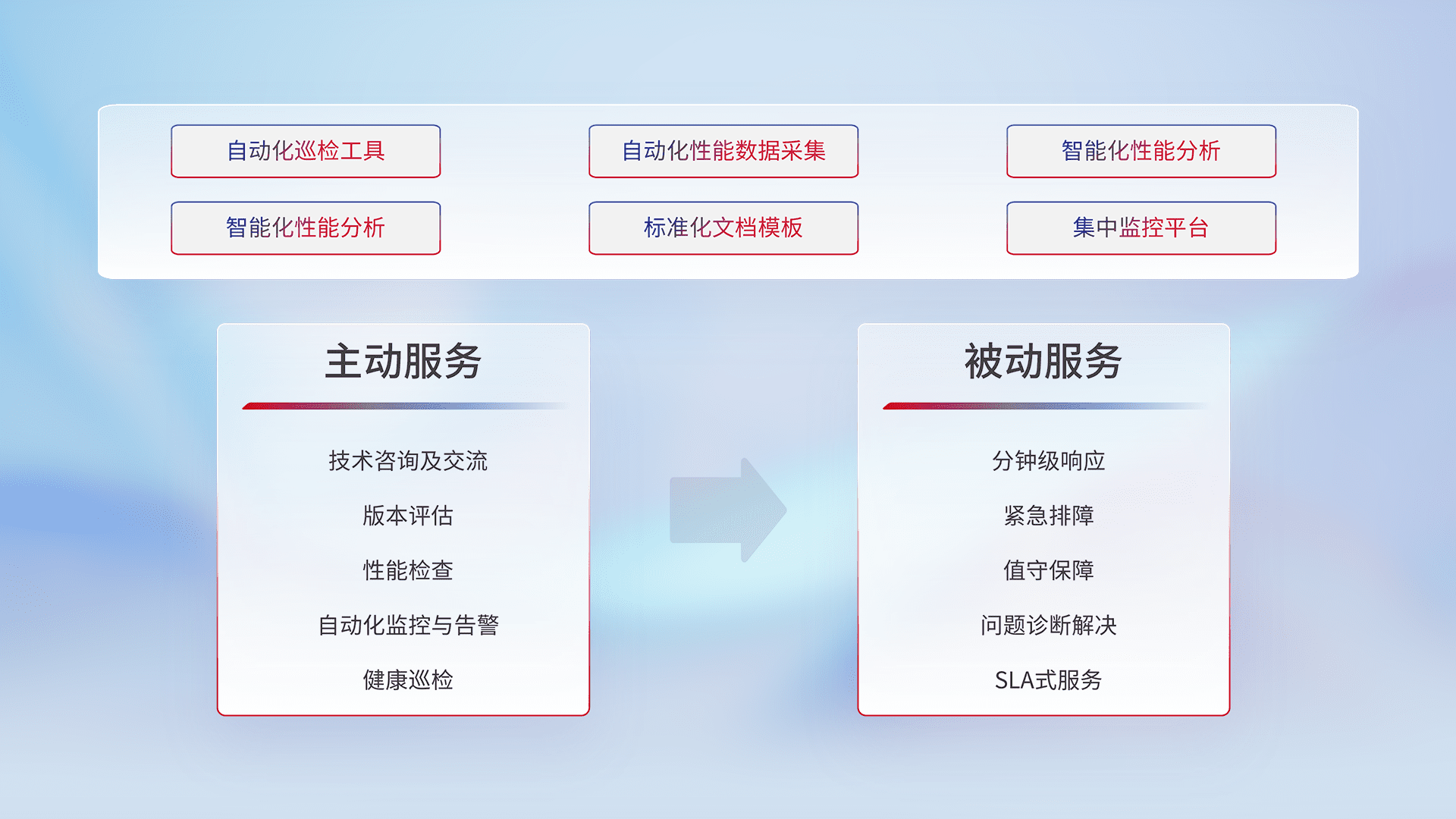 智能化工具和标准化文档,,保障服务质量,,,,提供主动服务(包含技术咨询、、版本评估、、、性能检查、、、、自动化监控与告警、、健康巡检)和被动服务包含(分钟级响应、、、、紧急排障、、、、值守保障、、、问题诊断解决、、、、SLA服务)。。。。